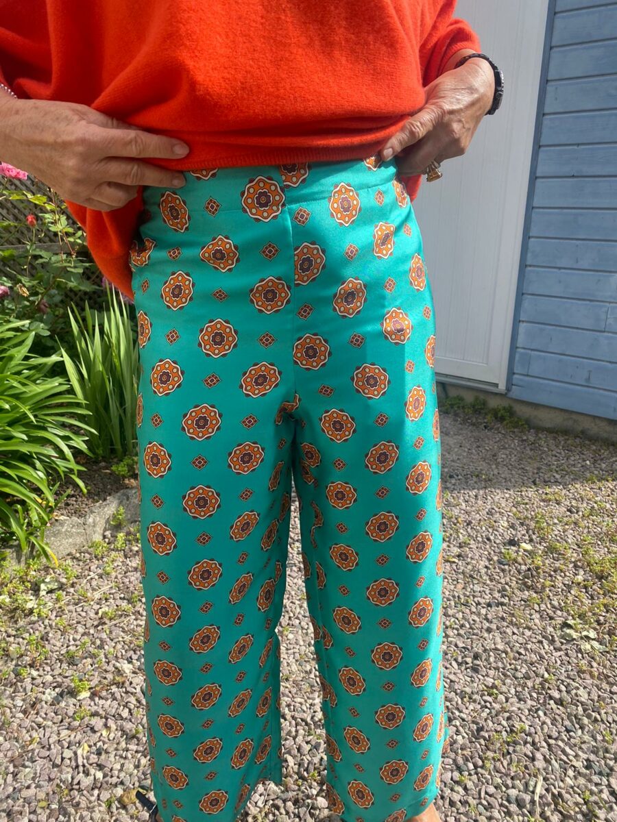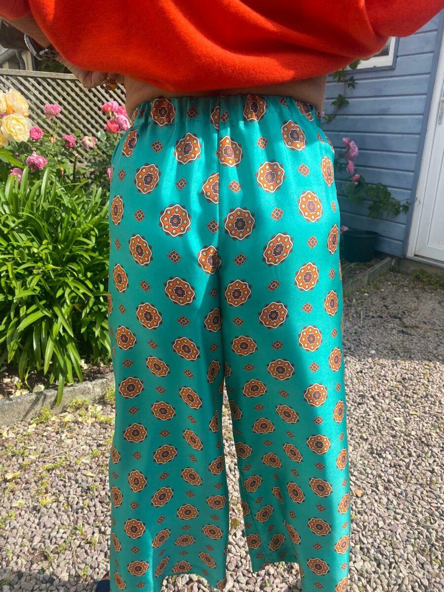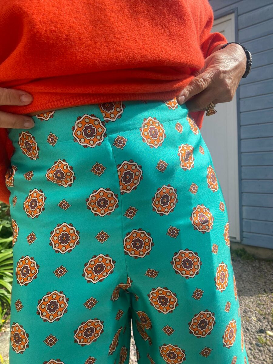PANTALON TURQUOISE MOTIFS ORANGE / Entretien PROGRAMME LAINE / 100% SOIE